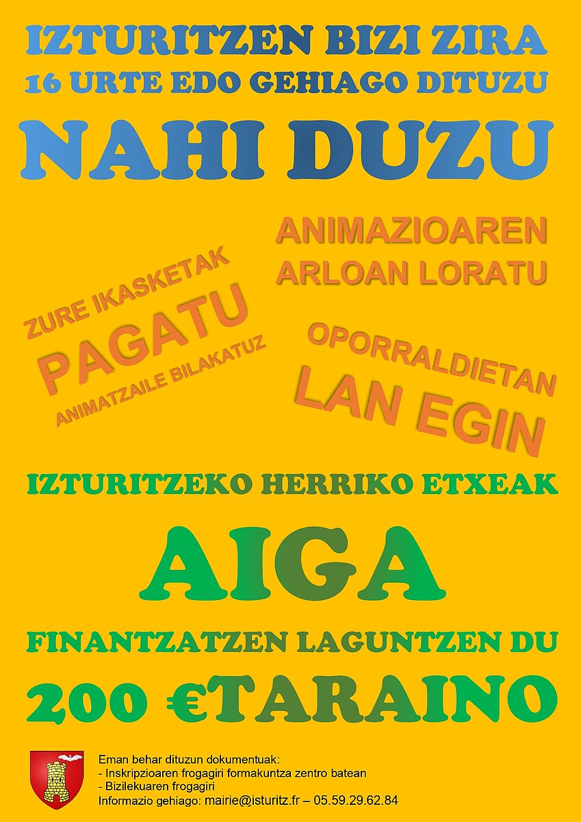 Herriko Etxeak 2024ko otsailaren 3an deliberatu zuen Animatzaile Izateko Gaitasun Agiriaren (AIGA) kostuaren zati bat (200 €) finantzatzen laguntzea, herrian bizi diren 16 urtez goitiko gazteentzat, familiaren zergapeko irabaziak edozein izan daitezen.